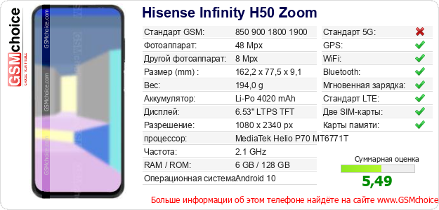 Данные о телефоне Hisense Infinity H50 Zoom на Вашем сайте