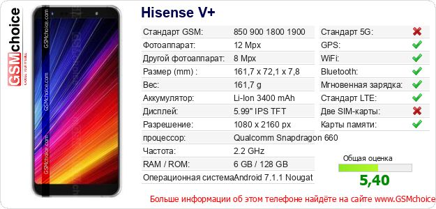 Данные о телефоне Hisense V+ на Вашем сайте
