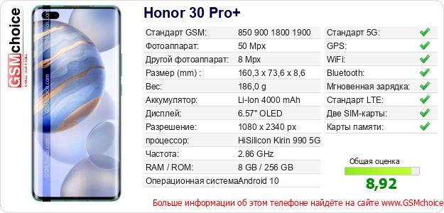 Данные о телефоне Honor 30 Pro+ на Вашем сайте