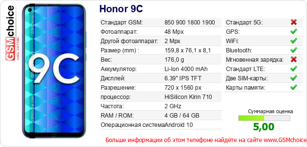 У Тебя есть свой сайт? Хочешь где-то разместить информацию о базовых данных мобильника Honor 9C ? Это запросто устроить. Достаточно скачать картинку или скопировать и разместить на соответствующем сайте нижерасположенный код:Размещение этого кода вызовет появление нижерасположенной картинки: