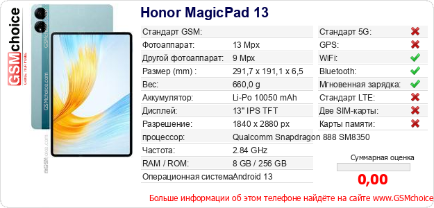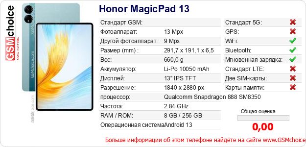 Данные о телефоне Honor MagicPad 13 на Вашем сайте