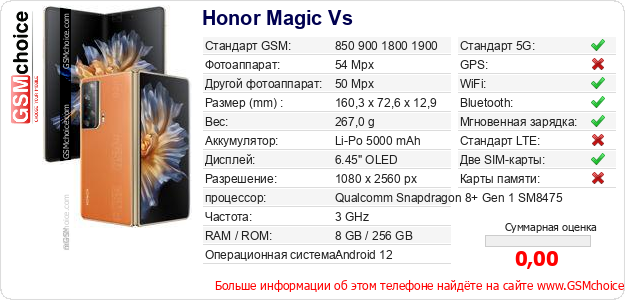 Данные о телефоне Honor Magic Vs на Вашем сайте