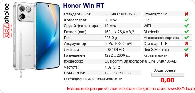 У Тебя есть свой сайт? Хочешь где-то разместить информацию о базовых данных мобильника Honor Win RT ? Это запросто устроить. Достаточно скачать картинку или скопировать и разместить на соответствующем сайте нижерасположенный код:Размещение этого кода вызовет появление нижерасположенной картинки: