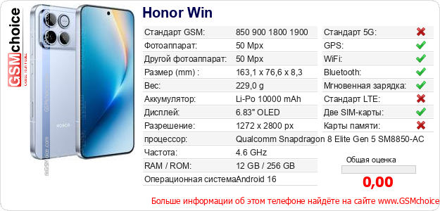 У Тебя есть свой сайт? Хочешь где-то разместить информацию о базовых данных мобильника Honor Win ? Это запросто устроить. Достаточно скачать картинку или скопировать и разместить на соответствующем сайте нижерасположенный код:Размещение этого кода вызовет появление нижерасположенной картинки: