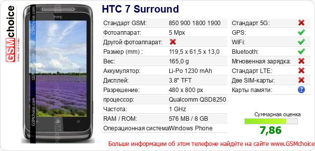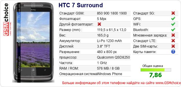 Данные о телефоне HTC 7 Surround на Вашем сайте