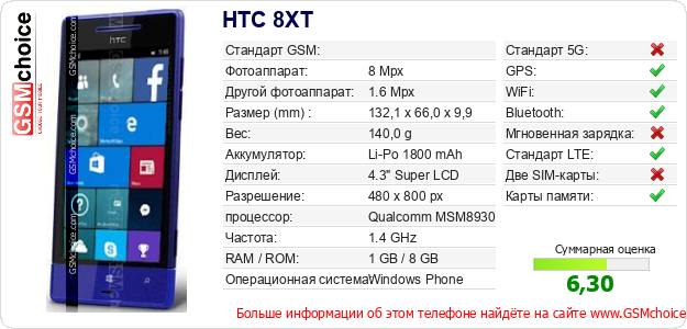 Данные о телефоне HTC 8XT на Вашем сайте
