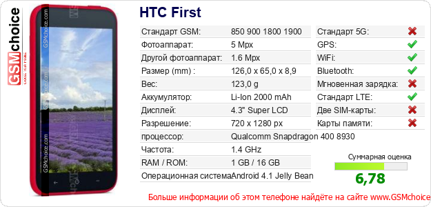 У Тебя есть свой сайт? Хочешь где-то разместить информацию о базовых данных мобильника HTC First ? Это запросто устроить. Достаточно скачать картинку или скопировать и разместить на соответствующем сайте нижерасположенный код:Размещение этого кода вызовет появление нижерасположенной картинки: