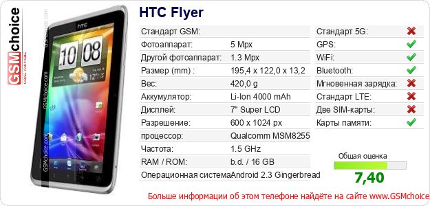 У Тебя есть свой сайт? Хочешь где-то разместить информацию о базовых данных мобильника HTC Flyer ? Это запросто устроить. Достаточно скачать картинку или скопировать и разместить на соответствующем сайте нижерасположенный код:Размещение этого кода вызовет появление нижерасположенной картинки: