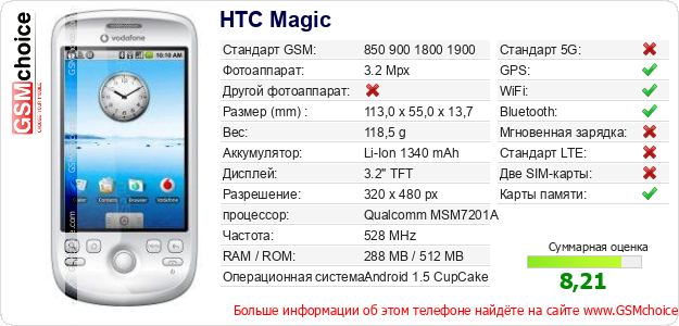 У Тебя есть свой сайт? Хочешь где-то разместить информацию о базовых данных мобильника HTC Magic ? Это запросто устроить. Достаточно скачать картинку или скопировать и разместить на соответствующем сайте нижерасположенный код:Размещение этого кода вызовет появление нижерасположенной картинки: