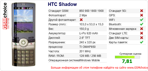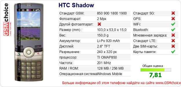 Данные о телефоне HTC Shadow на Вашем сайте