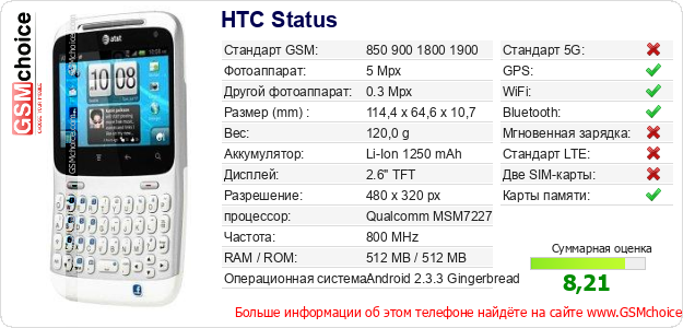 Данные о телефоне HTC Status на Вашем сайте