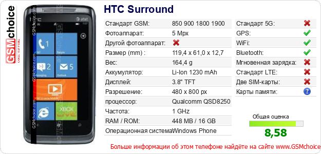 У Тебя есть свой сайт? Хочешь где-то разместить информацию о базовых данных мобильника HTC Surround ? Это запросто устроить. Достаточно скачать картинку или скопировать и разместить на соответствующем сайте нижерасположенный код:Размещение этого кода вызовет появление нижерасположенной картинки: