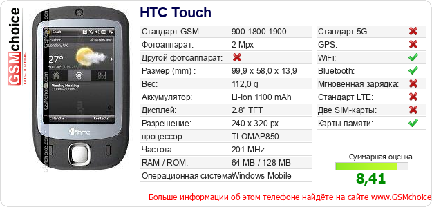 Данные о телефоне HTC Touch на Вашем сайте