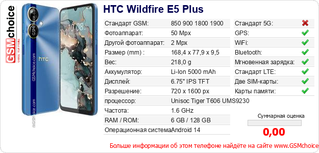 Данные о телефоне HTC Wildfire E5 Plus на Вашем сайте