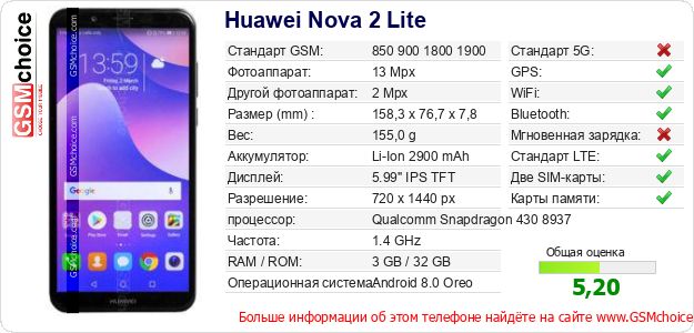 Данные о телефоне Huawei Nova 2 Lite на Вашем сайте