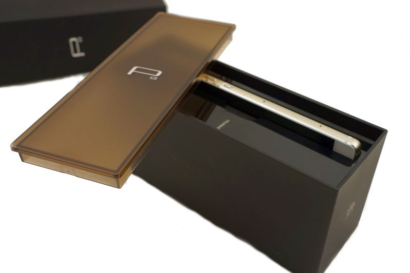 Упаковка пластмассовая. Полупрозрачные полоски демонстрируют бока смартфона. Черная вкладка с логотипом производителя отлично выделяет одну из черт корпуса P8, то есть тонкость. После извлечения мобильника и пластмассовой рамки, мы видим две меньшие коробочки.