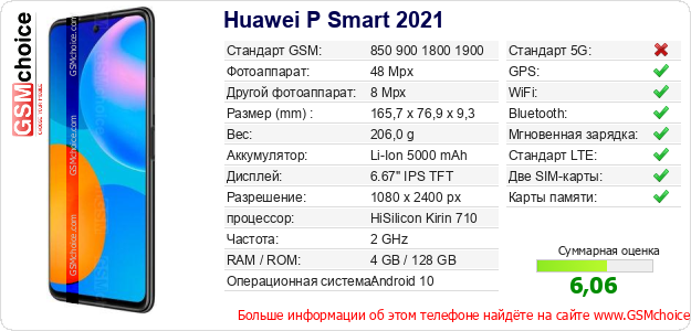 Данные о телефоне Huawei P Smart 2021 на Вашем сайте