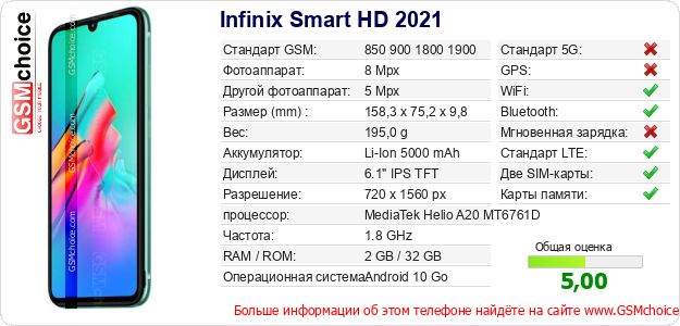 Данные о телефоне Infinix Smart HD 2021 на Вашем сайте