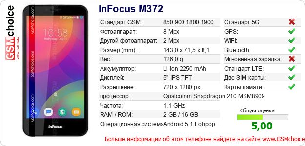 У Тебя есть свой сайт? Хочешь где-то разместить информацию о базовых данных мобильника InFocus M372 ? Это запросто устроить. Достаточно скачать картинку или скопировать и разместить на соответствующем сайте нижерасположенный код:Размещение этого кода вызовет появление нижерасположенной картинки: