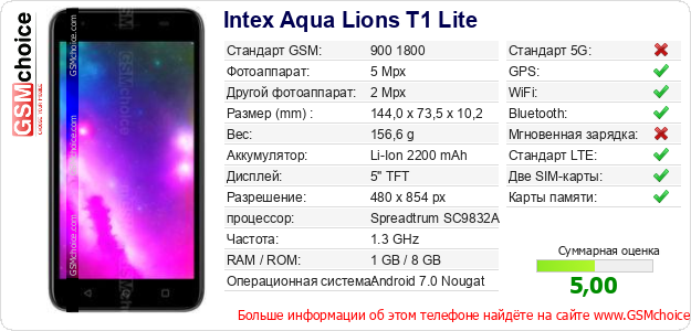 Данные о телефоне Intex Aqua Lions T1 Lite на Вашем сайте