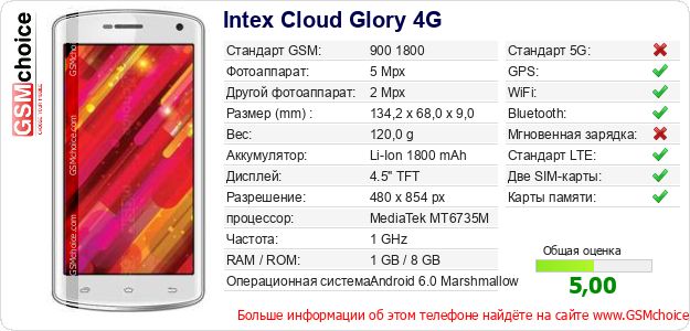 Данные о телефоне Intex Cloud Glory 4G на Вашем сайте