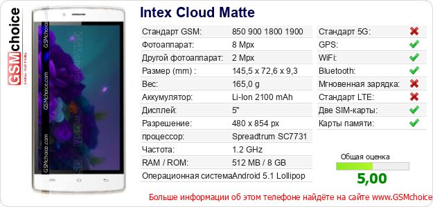 Данные о телефоне Intex Cloud Matte на Вашем сайте