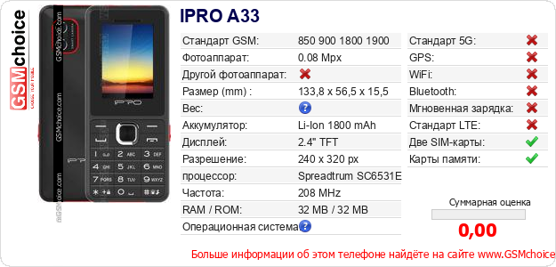У Тебя есть свой сайт? Хочешь где-то разместить информацию о базовых данных мобильника IPRO A33 ? Это запросто устроить. Достаточно скачать картинку или скопировать и разместить на соответствующем сайте нижерасположенный код:Размещение этого кода вызовет появление нижерасположенной картинки: