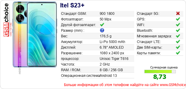 У Тебя есть свой сайт? Хочешь где-то разместить информацию о базовых данных мобильника Itel S23+ ? Это запросто устроить. Достаточно скачать картинку или скопировать и разместить на соответствующем сайте нижерасположенный код:Размещение этого кода вызовет появление нижерасположенной картинки:
