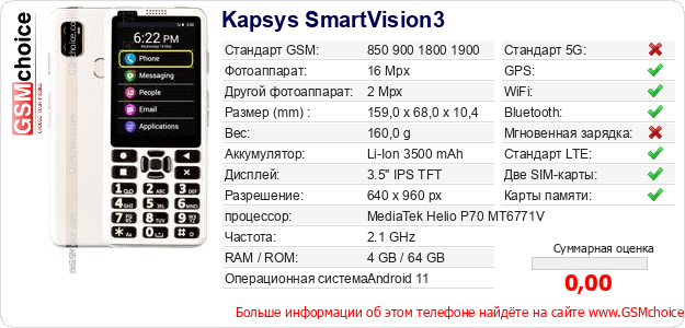Данные о телефоне Kapsys SmartVision3 на Вашем сайте