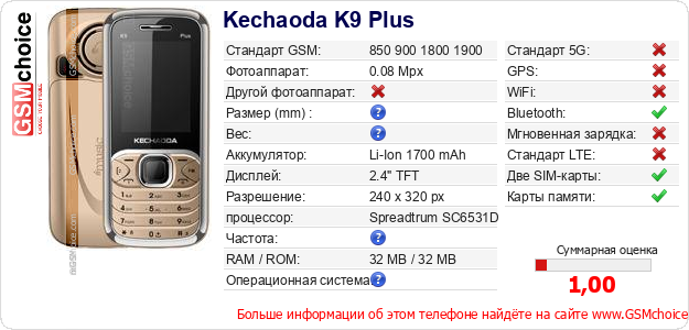 Данные о телефоне Kechaoda K9 Plus на Вашем сайте