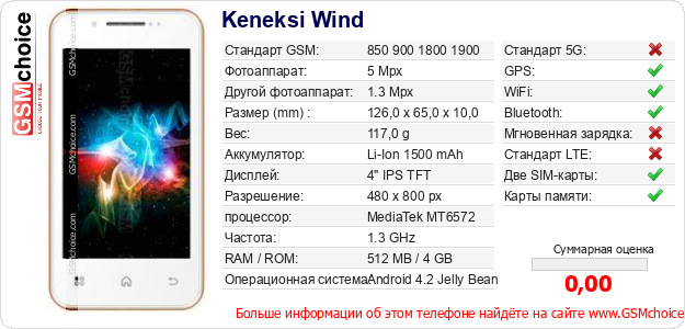 Данные о телефоне Keneksi Wind на Вашем сайте