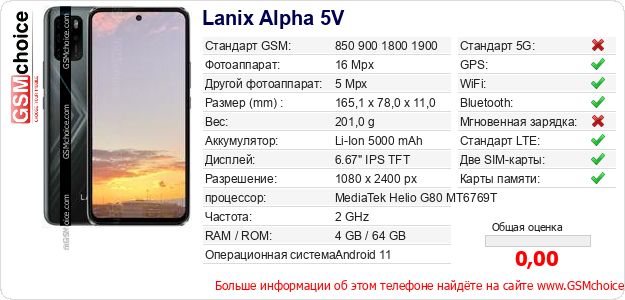 Данные о телефоне Lanix Alpha 5V на Вашем сайте