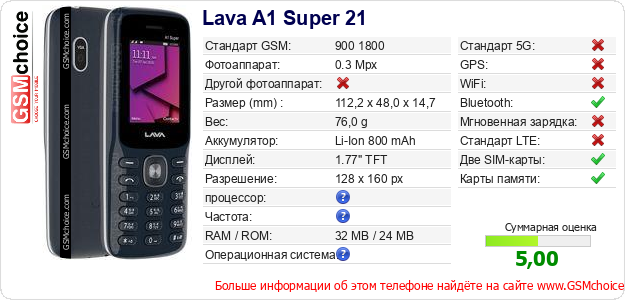 Данные о телефоне Lava A1 Super 21 на Вашем сайте