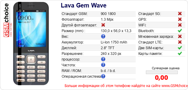 Данные о телефоне Lava Gem Wave на Вашем сайте