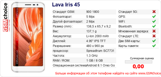 Данные о телефоне Lava Iris 45 на Вашем сайте