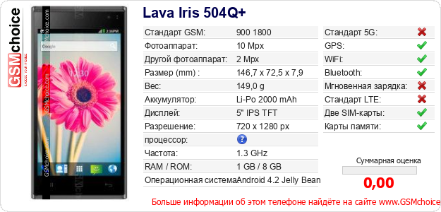 Данные о телефоне Lava Iris 504Q+ на Вашем сайте
