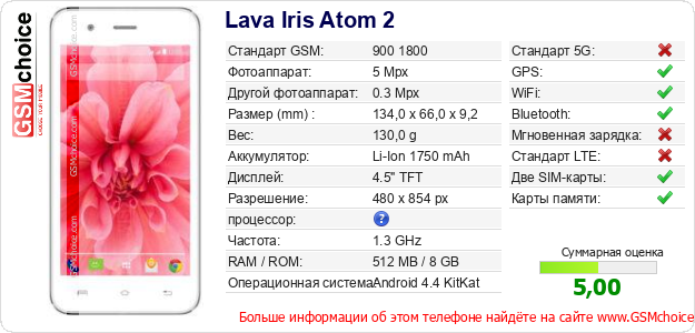 Данные о телефоне Lava Iris Atom 2 на Вашем сайте