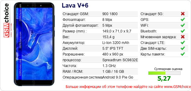 У Тебя есть свой сайт? Хочешь где-то разместить информацию о базовых данных мобильника Lava V+6 ? Это запросто устроить. Достаточно скачать картинку или скопировать и разместить на соответствующем сайте нижерасположенный код:Размещение этого кода вызовет появление нижерасположенной картинки: