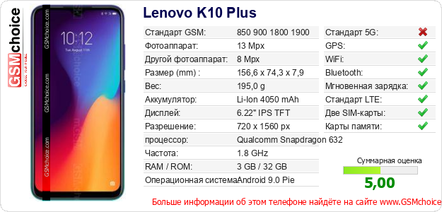 Данные о телефоне Lenovo K10 Plus на Вашем сайте