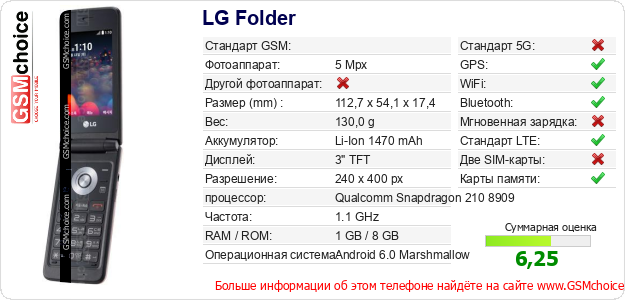 У Тебя есть свой сайт? Хочешь где-то разместить информацию о базовых данных мобильника LG Folder ? Это запросто устроить. Достаточно скачать картинку или скопировать и разместить на соответствующем сайте нижерасположенный код:Размещение этого кода вызовет появление нижерасположенной картинки:
