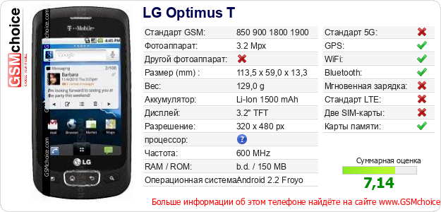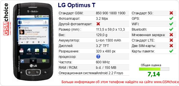 Данные о телефоне LG Optimus T на Вашем сайте