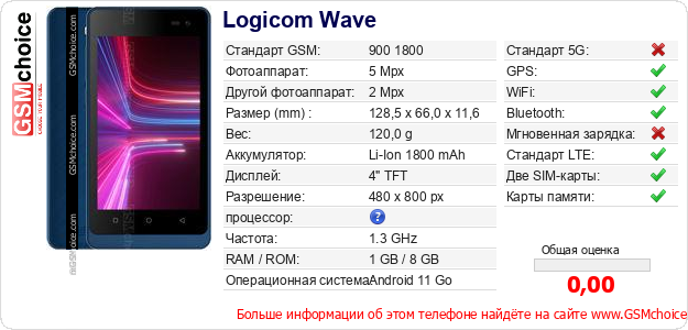 У Тебя есть свой сайт? Хочешь где-то разместить информацию о базовых данных мобильника Logicom Wave ? Это запросто устроить. Достаточно скачать картинку или скопировать и разместить на соответствующем сайте нижерасположенный код:Размещение этого кода вызовет появление нижерасположенной картинки:
