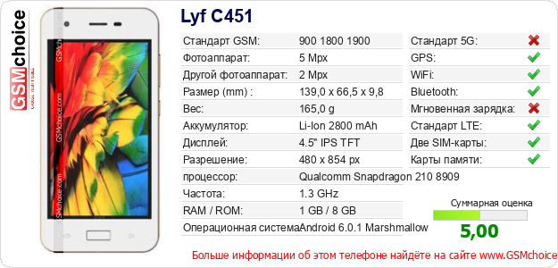 У Тебя есть свой сайт? Хочешь где-то разместить информацию о базовых данных мобильника Lyf C451 ? Это запросто устроить. Достаточно скачать картинку или скопировать и разместить на соответствующем сайте нижерасположенный код:Размещение этого кода вызовет появление нижерасположенной картинки:
