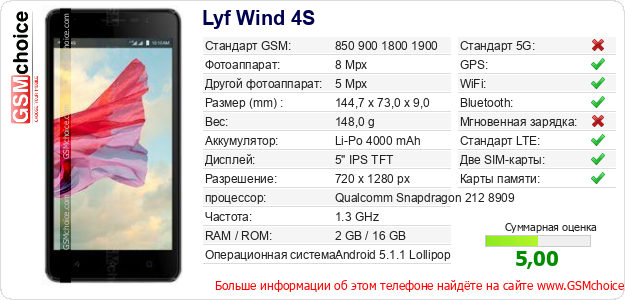 Данные о телефоне Lyf Wind 4S на Вашем сайте