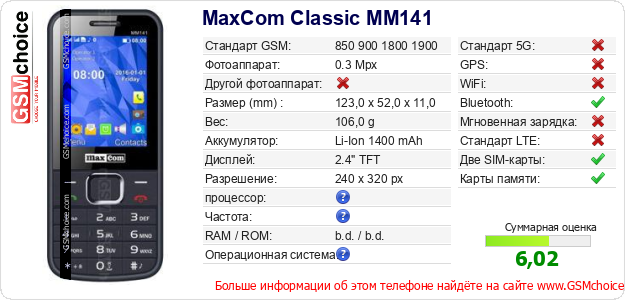 Данные о телефоне MaxCom Classic MM141 на Вашем сайте