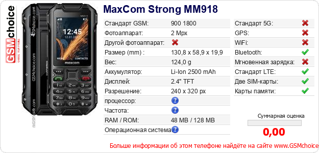 Данные о телефоне MaxCom Strong MM918 на Вашем сайте