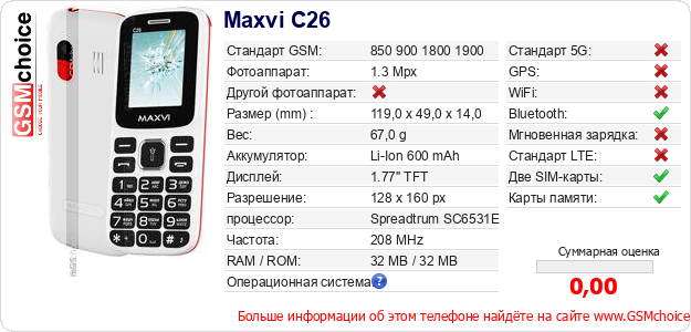 Данные о телефоне Maxvi C26 на Вашем сайте