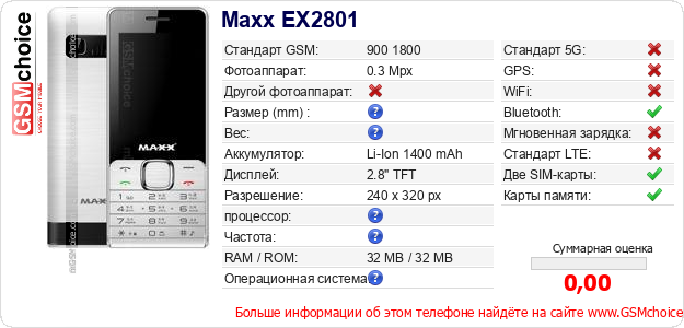 Данные о телефоне Maxx EX2801 на Вашем сайте
