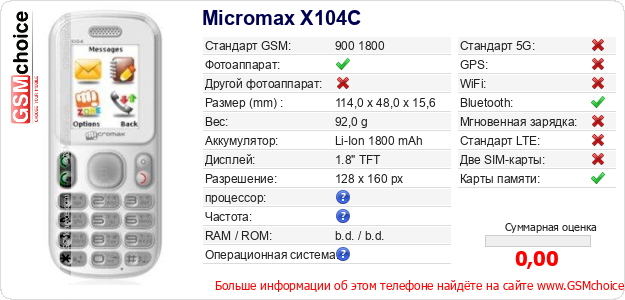 У Тебя есть свой сайт? Хочешь где-то разместить информацию о базовых данных мобильника Micromax X104C ? Это запросто устроить. Достаточно скачать картинку или скопировать и разместить на соответствующем сайте нижерасположенный код:Размещение этого кода вызовет появление нижерасположенной картинки: