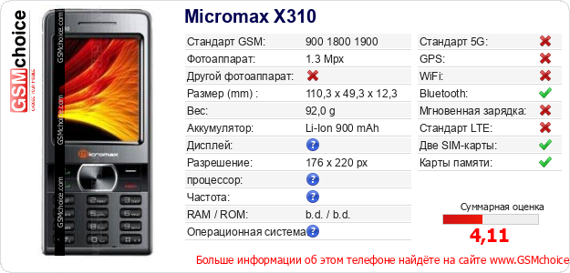 Данные о телефоне Micromax X310 на Вашем сайте
